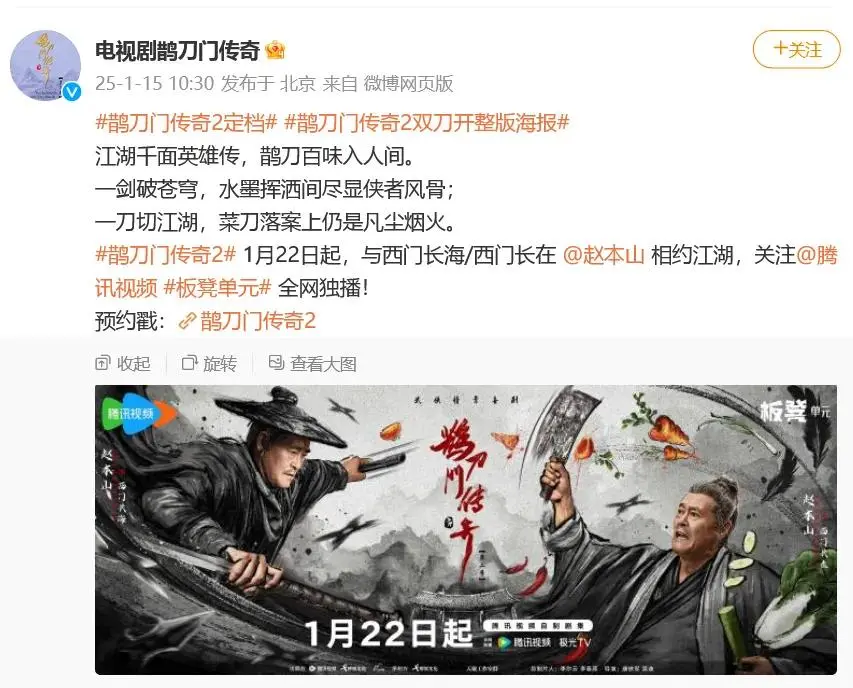 《乡村爱情17》官宣定档后,《鹊刀门传奇2》也官宣定档1月22日。“1月22日起,与西门长海/西门长在赵本山相约江湖,关注腾讯视频板凳单元全网独播!”